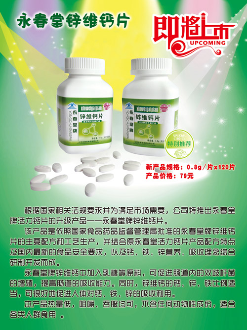 永春堂牌活力鈣片的升級(jí)產(chǎn)品—永春堂牌鋅維鈣片鋅維鈣片:國(guó)食健字G20080410,國(guó)家食品藥品監(jiān)督管理局批準(zhǔn)。 根據(jù)國(guó)家相關(guān)法規(guī)要求為并滿足市場(chǎng)需要,公司特推出永春堂牌活力鈣片的升級(jí)產(chǎn)品—永春堂牌鋅維鈣片?! ≡摦a(chǎn)品是依照國(guó)家食品藥品監(jiān)督管理局批準(zhǔn)的永春堂牌鋅維鈣片的主要配方和工藝生產(chǎn),并結(jié)合原永春堂活力鈣片產(chǎn)品配方特點(diǎn)及國(guó)內(nèi)最新的食品安全要求,以及鈣、鐵、鋅營(yíng)養(yǎng)、吸收理念綜合研制...