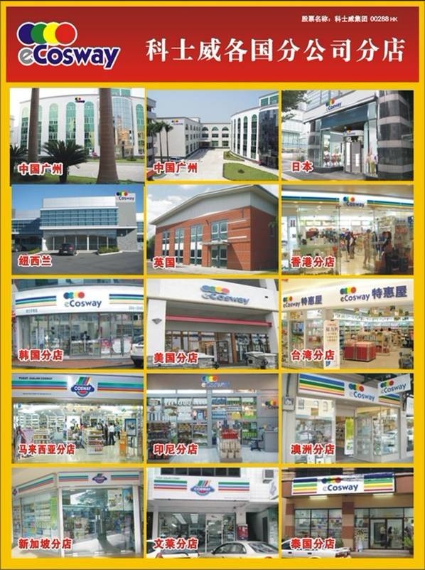 一、實(shí)體店鋪折扣店 除科士威折扣店鋪馬來西亞地區(qū)有400多間銷售超過2000種商品的折扣店外。菲律賓近100間、泰國有100多間、新加坡、印尼都設(shè)有實(shí)體折扣店。2005年2月在臺(tái)灣開業(yè),在八個(gè)月內(nèi),也開了64家折扣店現(xiàn)在已經(jīng)400家店鋪;香港店鋪于2006年9月開業(yè),地址在九龍尖沙咀、廣東道188號,港景匯地下。在eCosway購物廣場,有來自世界各地種類繁多、物美價(jià)廉、高品質(zhì)的生活用品;包括健
