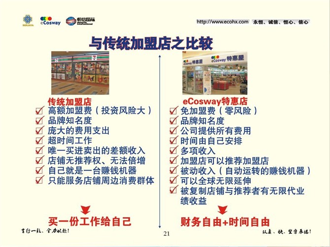 1、ecosway是什么?QQ584268603e科士威是電子商務(wù),像淘寶等網(wǎng)上購物,而又優(yōu)于淘寶,因為它支持全球宅配到府,由公司代替發(fā)貨。又和沃爾馬大型超市有點(diǎn)近似,產(chǎn)品種類繁多,有實體折扣店鋪,物美價廉。又和安利、玫琳凱等直銷的模式相似,因為它結(jié)合了直銷的一個獎金制度??剖客且粋€全新的互惠營銷商業(yè)模式,把消費(fèi)者、銀行、商家及業(yè)主(經(jīng)營者)有效的整合在一起,讓每個經(jīng)營者和消費(fèi)者都能輕松的參與到