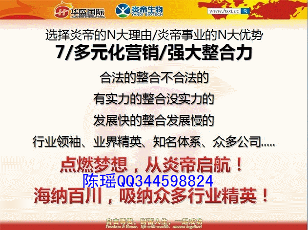 華盛國際認(rèn)識(shí)炎帝如果您有意或無意翻開了此扉頁,衷心恭喜您,也許通過認(rèn)識(shí)炎帝生物,分享炎帝產(chǎn)品,了解炎帝事業(yè),您將會(huì)給自己一個(gè)成長甚至是成功的機(jī)會(huì)。炎帝生物的成立,起源于對(duì)始祖炎帝厚德載物、造福蒼生精神的傳承與創(chuàng)新,我們?nèi)趨R了中華五千年優(yōu)秀文化底蘊(yùn)及現(xiàn)代生物高科技,致力于引領(lǐng)綠色生活,創(chuàng)造綠色財(cái)富,為廣大事業(yè)伙伴和消費(fèi)者開創(chuàng)誠信、健康、富足、友愛、快樂的美好生活。2011年之后,炎帝生物將成為一家在