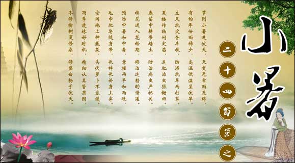 后天就是七月七日小暑天?!岸分感翞樾∈?,斯時(shí)天氣已熱,尚未達(dá)淤極點(diǎn),故名也”。太陽(yáng)黃經(jīng)為105度。天氣已經(jīng)很熱,但還不到最熱的時(shí)候,所以叫小暑。時(shí)至小暑,已是初伏前后,到處綠樹(shù)濃陰,很多地區(qū)的平均氣溫已接近30度,時(shí)有熱浪襲人之感,暴雨也時(shí)常在小暑節(jié)氣光顧我國(guó)的大部分。由于這段時(shí)間的雨量集中,所以防洪防澇顯得尤為重要。有農(nóng)諺:“大署小暑,灌死老鼠”之說(shuō)。更有“小暑南風(fēng),大署旱”“小暑打雷,大署破圩