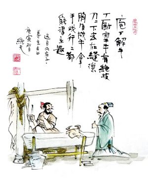 “養(yǎng)生”一詞最早出現(xiàn)在我國的兩本古籍上,一處見于《莊子·養(yǎng)生主》中的“庖丁解?!币晃?,另一處見于《黃帝內(nèi)經(jīng)·靈樞》中的“木神”?!扳叶〗馀!钡墓适?,我們?cè)谥袑W(xué)的語文課本上都學(xué)過,它出現(xiàn)在我國著名思想家莊子的《養(yǎng)生主》這篇文章中?!娥B(yǎng)生主》是一篇專門談養(yǎng)生之道的文章,“養(yǎng)生主”的意思就是養(yǎng)生的要領(lǐng)。莊子認(rèn)為:養(yǎng)生之道重在順應(yīng)自然,忘卻情感,不為外物所滯。我先給大家簡(jiǎn)單介紹一下“庖丁”是什么意思。“庖