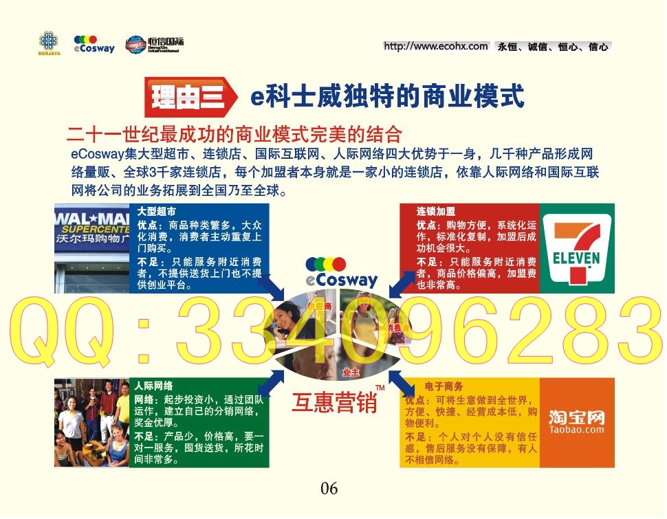 ★★★★★世界首富比爾蓋茨:誰能掌握通路,他就能掌握成功之路!21世紀(jì)要么電子商務(wù),要么無務(wù)可商!★★★★★李嘉誠:當(dāng)一個(gè)新生事物出現(xiàn),5%人做這就是機(jī)會,50%知道做個(gè)消費(fèi)者,超過50%你看都不用去看!什么是科士威?---簡單說科士威是一個(gè)跨國經(jīng)營33年國際型大超市消費(fèi)就加盟會員享有會員價(jià)同時(shí)每次消費(fèi)都有業(yè)績積分在你后面辦會員卡的朋友他們的消費(fèi)也都會納入你的業(yè)績業(yè)績用于計(jì)算獎(jiǎng)金,也就是省錢加賺錢