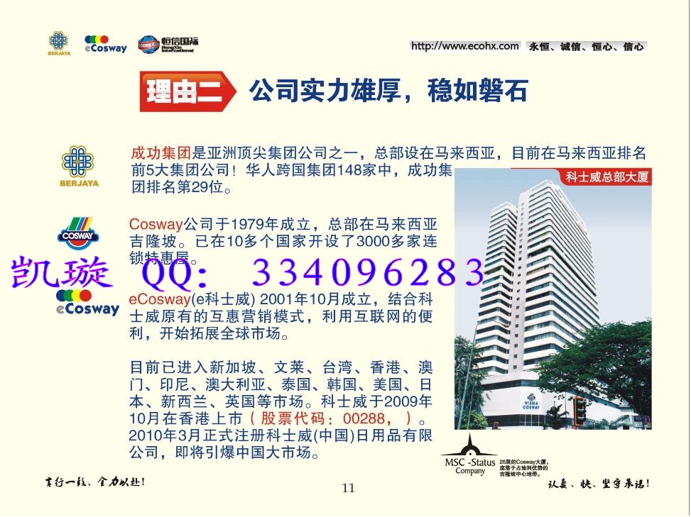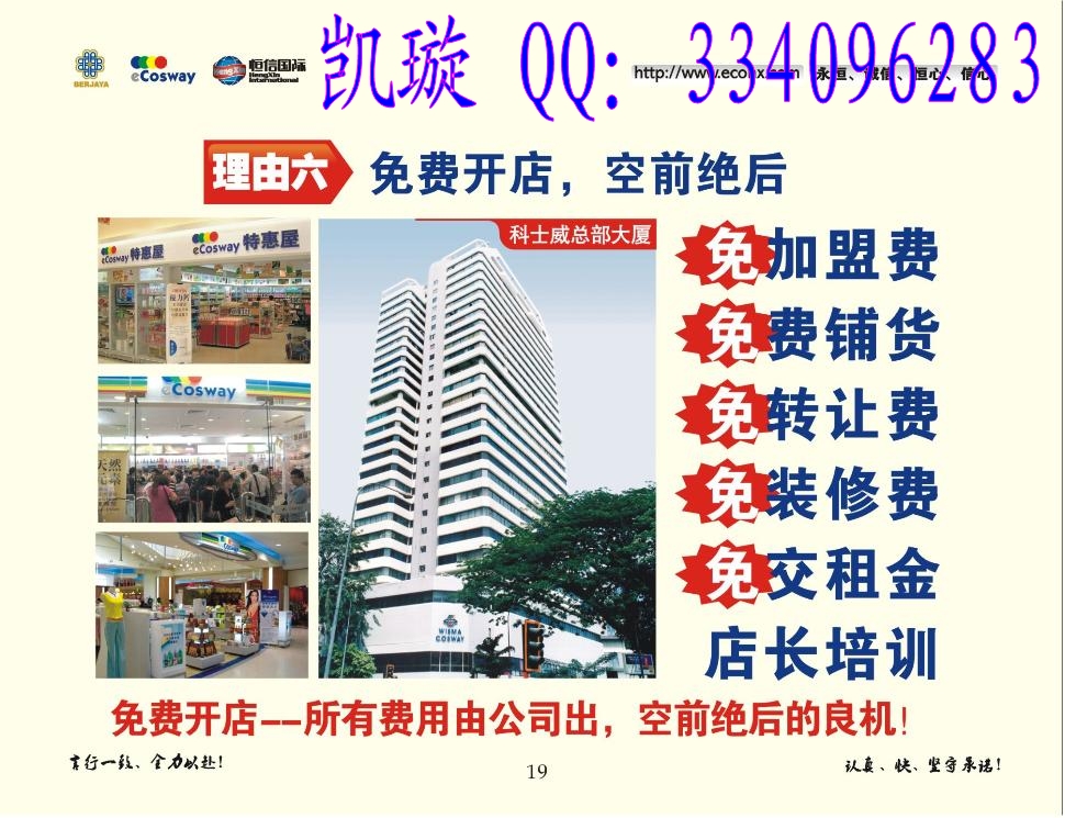 科士威公司(Cosway)——吉隆坡證券交易所股票上市公司(代碼4812),成立于1979年12月,隸屬于成功集團(tuán)轄下的科士威集團(tuán)??剖客目偛课挥隈R來西亞,在菲律賓、泰國、新加坡及墨西哥設(shè)有分公司??剖客幌蛞浴疤峁┫M(fèi)者價(jià)格便宜的優(yōu)良商品”為經(jīng)營理念,通過郵購及折扣商店的方式,提供給消費(fèi)者種類眾多且價(jià)格確實(shí)便宜的優(yōu)良商品,在日用品的市場中以互惠營銷的概念,將消費(fèi)者及經(jīng)營者串聯(lián)起來,成功地落實(shí)了