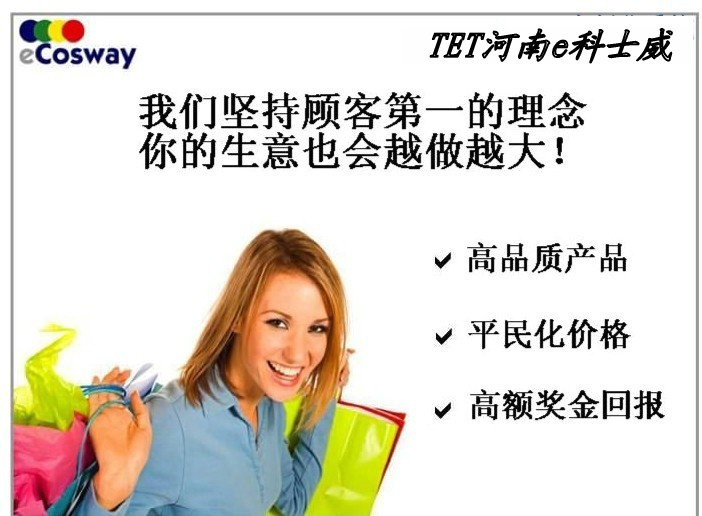 選擇科士威的理由第一;趨勢(shì)第二;公司實(shí)力雄厚穩(wěn)如磐石第三‘獨(dú)特的商業(yè)模式電子商務(wù)量販經(jīng)營(yíng)連鎖店人際網(wǎng)絡(luò)第四;產(chǎn)品多元化顧客群廣泛第五;國(guó)際化的產(chǎn)品大眾化的價(jià)位永恒的競(jìng)爭(zhēng)優(yōu)勢(shì)第六;免費(fèi)開(kāi)店空前絕后第七;最佳的時(shí)機(jī)