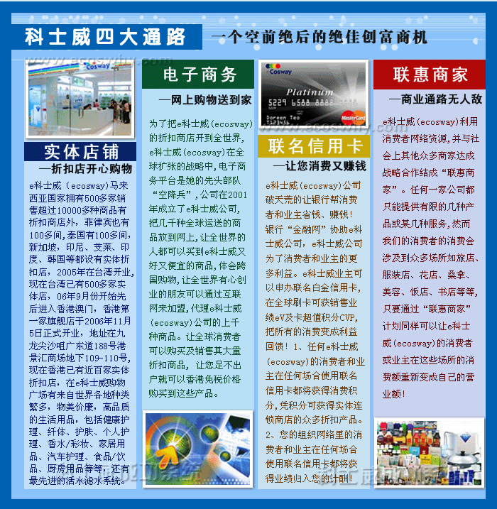 選擇直銷公司的五個(gè)黃金標(biāo)準(zhǔn)時(shí)代造就英雄,英雄創(chuàng)造時(shí)代!科士威電子商務(wù)直銷閃爍當(dāng)今時(shí)代!QQ584268603“每一個(gè)商務(wù)時(shí)代,都會(huì)鍛煉一大批富翁。而每一個(gè)富翁的鍛造,都是當(dāng)別人不明白時(shí),他明白自己在做什么。所以當(dāng)別人明白時(shí)他已經(jīng)成功了,當(dāng)別人理解時(shí)他已經(jīng)富有了!人的一生,因不同的選擇造就不同的機(jī)遇。努力固然重要,選擇比努力更重要,機(jī)遇常常在猶豫和懷疑中錯(cuò)過,不嘗試你永遠(yuǎn)不會(huì)成功。” 每家公司都在
