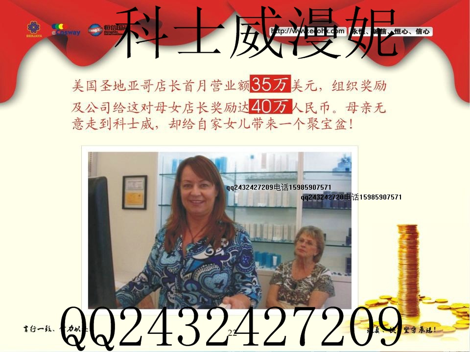 32年經(jīng)營(yíng)歷史。產(chǎn)品上千種類、價(jià)廉物美、制度業(yè)績(jī)沒有壓力,更能讓人通過努力達(dá)致成功的事業(yè)! 不必自己找貨源,不須進(jìn)貨成本,不必承擔(dān)積貨屯貨的風(fēng)險(xiǎn),不必自己找物流送貨,提供給您一個(gè)個(gè)人網(wǎng)店,免費(fèi)代理全球最有性價(jià)比的名牌商品,您覺得可以?那么請(qǐng)聯(lián)系我們,我們會(huì)告訴您如何足不出戶,打造您的網(wǎng)上“沃爾瑪”,網(wǎng)絡(luò)地面同時(shí)經(jīng)營(yíng),擁有一家經(jīng)營(yíng)幾千款世界知名品牌的網(wǎng)上超市嗎?類別包括家居日用、美容護(hù)膚、營(yíng)養(yǎng)保健、香水彩妝、汽車保養(yǎng)、廚房用品、還有食品飲品等等高品質(zhì)的生活用品,日常能用到的幾乎都有,還有最先進(jìn)技術(shù)制造的活水濾水系統(tǒng)。實(shí)體店上萬種,網(wǎng)上近千種,實(shí)體店可以滿足人80%的需要。一個(gè)全新的消費(fèi)致富事業(yè)平臺(tái).只要你將日常生活必需品換一個(gè)消費(fèi)場(chǎng)所,你可以從中獲益.也可這樣說有發(fā)展?jié)摿?,一臺(tái)電腦一根網(wǎng)線在家就能做遍全球,貨源、物流、信息流、發(fā)貨、售后服務(wù)等等都由公司提供, 需要詳細(xì)了解這個(gè)事業(yè)聯(lián)系QQ:2432427209