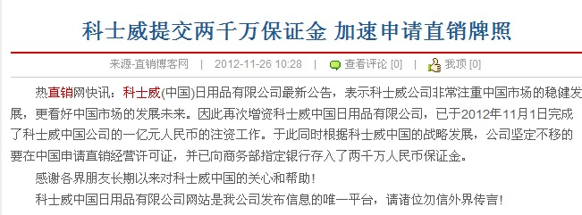 現(xiàn)在沒有,不過馬上有了。那有的朋友會問,沒有直銷牌照,合法嗎?首先電子商務還沒有立法,所以不存在合法不合法的問題。再次大家都是知道,在中國維邁店鋪里都是科士威的產(chǎn)品。而且在2010年3月2日,中國科士威有限公司已經(jīng)注冊,注冊號:440101400033224,不過由于中國的過請,必須拿到直銷牌照,
