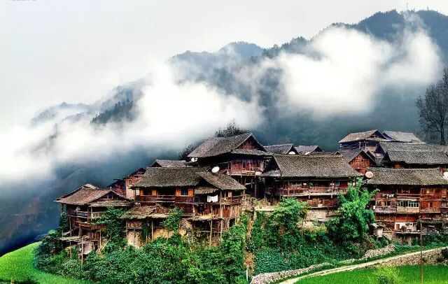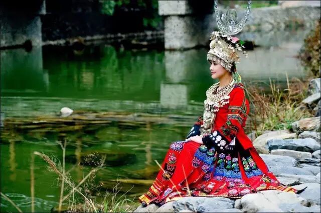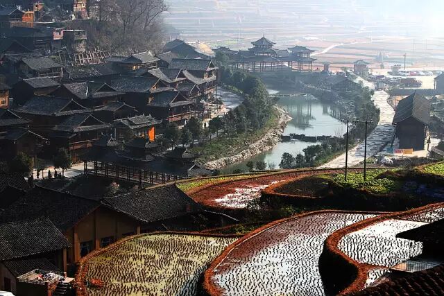 西江千戶苗寨四面環(huán)山,重巒疊嶂,梯田依山順勢直連云天,白水河穿寨而過,將西江苗寨一分為二。寨內吊腳樓層層疊 疊順山勢而建,又連綿成片,房前屋后有翠竹點綴,門前有長廊,圍有木欄,設有長凳,苗家姑娘多在此 挑花刺繡,人稱長廊木凳為"美人靠"。