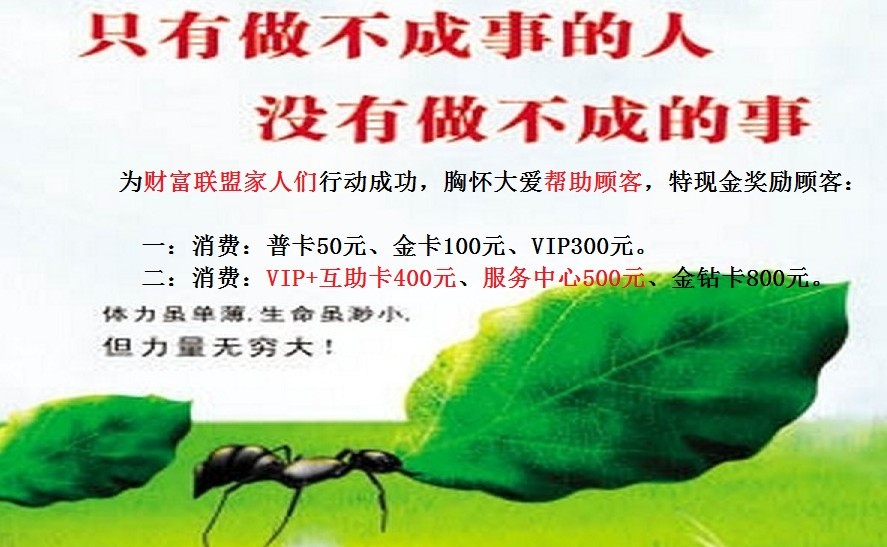 為慶祝財(cái)富聯(lián)盟六大常委隆重登場(chǎng),為輔助財(cái)富家人行動(dòng)成功,胸懷大愛(ài)幫助和關(guān)愛(ài)顧客,特推出現(xiàn)金獎(jiǎng)勵(lì)顧客,讓顧客一進(jìn)門就賺錢: