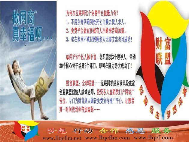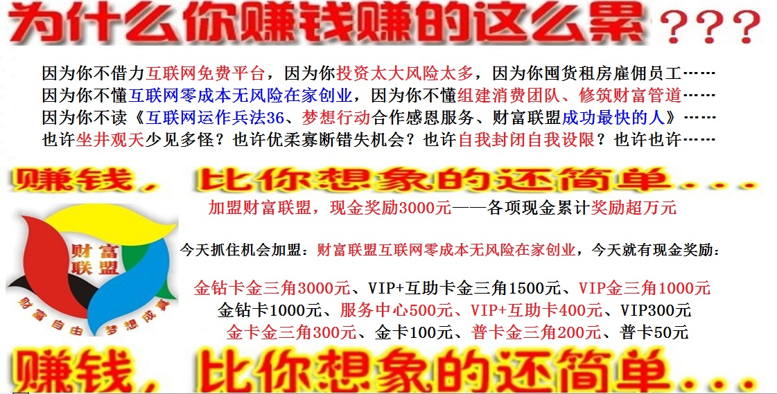 財(cái)富聯(lián)盟尋找和幫助不愿意東奔西跑勞苦奔波受盡風(fēng)吹雨打嚴(yán)寒酷署煎熬,而希望在家創(chuàng)業(yè)以小博大一根網(wǎng)線一臺(tái)電腦一杯咖啡一件睡衣,就可以輕松借助互聯(lián)網(wǎng)零成本在家創(chuàng)業(yè),服務(wù)全球消費(fèi)者的順應(yīng)時(shí)代趨勢(shì)大成功的有志之士、 尋找和幫助 本身已有工作但想兼職在互聯(lián)網(wǎng)零成本在家創(chuàng)業(yè)修筑財(cái)富管道的有志之士、 尋找和幫助 不方便外出上班辛苦打工,必須在家照顧親人孩子的家庭主婦和模范煮夫借助互聯(lián)網(wǎng)零成本在家創(chuàng)業(yè)以及年老體弱不方便外出的退休養(yǎng)老之人……