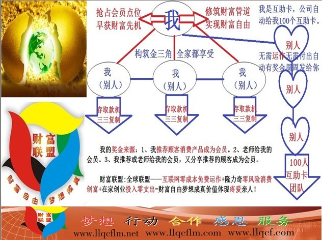 財(cái)富聯(lián)盟幫助數(shù)以千計(jì)萬(wàn)計(jì)的人在互聯(lián)網(wǎng)獲得了在家創(chuàng)業(yè)的成功、事業(yè)機(jī)會(huì)和價(jià)值尊嚴(yán),同時(shí)獲得了周薪過(guò)千月入過(guò)萬(wàn)的財(cái)富管道收入,幫助千千萬(wàn)萬(wàn)的個(gè)人和家庭享受了隆力奇的優(yōu)質(zhì)產(chǎn)品,帶給了他們健康美麗和諧幸福的新生活,傳播了財(cái)富聯(lián)盟:全球聯(lián)盟——互聯(lián)網(wǎng)零成本零風(fēng)險(xiǎn)在家創(chuàng)業(yè)聯(lián)盟(五大文化:夢(mèng)想、行動(dòng)、合作、感恩、服務(wù))的博大關(guān)愛(ài)。