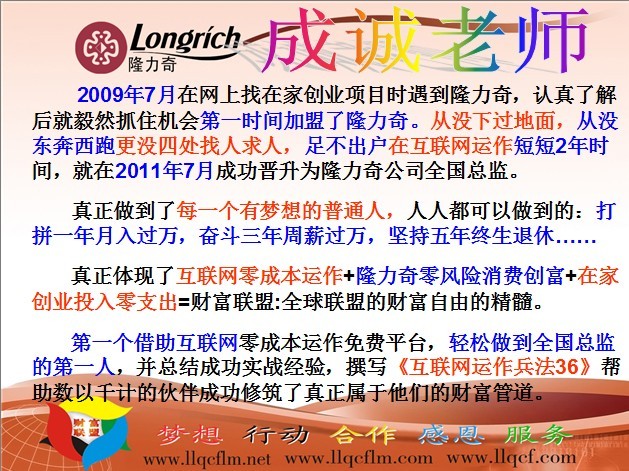 成誠(chéng)老師加盟隆力奇的時(shí)候,他就創(chuàng)辦了隆力奇財(cái)富聯(lián)盟:全球聯(lián)盟——互聯(lián)網(wǎng)零成本零風(fēng)險(xiǎn)在家創(chuàng)業(yè)導(dǎo)師,并提出了夢(mèng)想、行動(dòng)、合作、服務(wù)、感恩五大直銷理念。在互聯(lián)網(wǎng)上全心全意為傘下伙伴服務(wù),他的《互聯(lián)網(wǎng)直銷運(yùn)作實(shí)戰(zhàn)——兵法36計(jì)》在直銷界頗有盛譽(yù)。