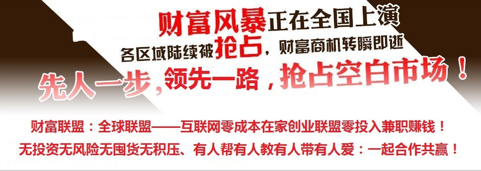 財富聯(lián)盟:全球聯(lián)盟——互聯(lián)網(wǎng)零成本零風險在家創(chuàng)業(yè)聯(lián)盟(五大文化:夢想、行動、合作、感恩、服務(wù))宗旨:尋找和幫助不愿意東奔西跑勞苦奔波受盡風吹雨打嚴寒酷署煎熬,而希望在家創(chuàng)業(yè)以小博大一根網(wǎng)線一臺電腦一杯咖啡一件睡衣,就可以輕松借助互聯(lián)網(wǎng)零成本在家創(chuàng)業(yè),服務(wù)全球消費者的順應(yīng)時代趨勢大成功的有志之士、尋找本身已有工作但想兼職在互聯(lián)網(wǎng)零成本在家創(chuàng)業(yè)修筑財富管道的有志之士、尋找不方便外出上班辛苦打工必須在家照顧親人孩子的家庭主婦和模范煮夫借助互聯(lián)網(wǎng)零成本在家創(chuàng)業(yè)以及年老體弱不方便外出的退休養(yǎng)老之人……