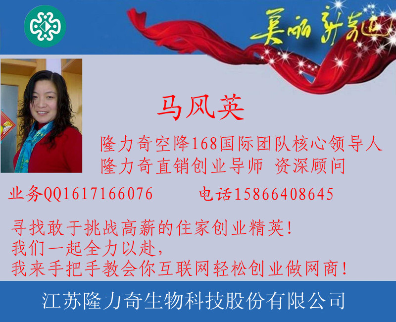 作者:馬風英 聯系方式QQ:1617166076電話:15866408645 .隆力奇直銷創(chuàng)業(yè)導師,資深顧問,網商教練!隆力奇直銷空降部隊168國際團隊創(chuàng)始人、資深直銷實戰(zhàn)專家,高級培訓導師。擅長于直銷團隊建立、人才培養(yǎng)與系統(tǒng)打造。尋找敢于挑戰(zhàn)高薪的住家創(chuàng)業(yè)精英!我們一起全力以赴,我來手把手教會你互聯網輕松創(chuàng)業(yè)做網商!