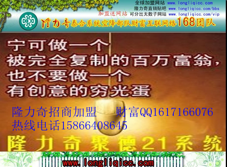 你好,當(dāng)你點開我的這篇文章就注定你我不平凡的相識?,F(xiàn)在花你幾分鐘的時間認(rèn)真看完下面的內(nèi)容,相信你一定會有意想不到的收獲。 我們都知道現(xiàn)在找一份工作很難,找一份長遠并有保障的工作更難,現(xiàn)在金飯碗的時代已經(jīng)一去不復(fù)返了?,F(xiàn)在的生意難做錢難掙,多少人辛辛苦苦的血汗錢投如商海血本無歸,大街小巷到處是門面轉(zhuǎn)讓的告示,被人們稱為開關(guān)廠。個人的處境實在是太難了,結(jié)婚,贍養(yǎng)父母,子女教育,住房,個人養(yǎng)老,醫(yī)療等一切都需要錢來解決。然而我們的收入是那樣低,工作是那么不穩(wěn)定,我們更沒有抗拒做生意失敗的能力,很多人都在思考怎樣增加自己的收入,減少自己的壓力。 現(xiàn)在我就給你介紹一個適合每個人的互聯(lián)網(wǎng)創(chuàng)業(yè)項目,我相信每個人都不會拒絕信息不會拒絕了解,因為大家都是不會拒絕財富的。這就是隆力奇電子商務(wù)事業(yè)。 隆力奇公司成立于1986年,是我國最大的日化生產(chǎn)企業(yè),公司注冊資金達一億六千四百萬人名幣,公司成立二十六年來平均每年40%以上的增長速度,年銷售額70多億人名幣,品牌價值超過百億。公司擁有3萬多名員工,隆力奇公司聚集了世界級頂級的專家領(lǐng)導(dǎo)組織新產(chǎn)品開發(fā)研制。隆力奇兩院一所科研機構(gòu)的完善,標(biāo)志著隆力奇產(chǎn)品結(jié)構(gòu)和科技含量進一步升級、吸納美容、日化高端人才,為振興民族產(chǎn)業(yè)做貢獻進入了一個嶄新的階段。隆力奇擁有完全自主的、強大的產(chǎn)品研發(fā)和生產(chǎn)能力。目前在國內(nèi)和美國、日本、法國等擁有世界頂級的科研機構(gòu)。此外還與清華大學(xué)、江南大學(xué)等知名學(xué)府聯(lián)合組辦研究中心。成立了由國家人事部批準(zhǔn)的隆力奇博士后科研工作站。擁有國內(nèi)規(guī)模最大的保健品和日化品生產(chǎn)基地。隆力奇獲得了許許多多的榮譽,例如:全球華人企業(yè)500強、中國500最具價值品牌、福布斯中國頂尖企業(yè)100強,榮譽數(shù)不勝數(shù)!隆力奇直銷產(chǎn)品有8大系列:1、蛇龜養(yǎng)生保健。2、雅妍美容護膚。3、家居清潔洗滌。4、個人護理洗浴。5、生食系列。 6、保健食品系列。7、熏香系列。8、活能保健器具系列。 隆力奇是中國第24家獲得直銷牌照的企業(yè)(在國家商務(wù)部直銷管理可以查到)。2009年7月25日拿到直銷牌照,2010年11月全面啟動互聯(lián)網(wǎng)電子商務(wù),已經(jīng)安全度過啟動期,現(xiàn)在處于發(fā)展初期,市場還是一片空白,必定是先做先得。 很多人通過隆力奇電子商務(wù)事業(yè)成功實現(xiàn)了自己的創(chuàng)業(yè)夢想,在短短兩三年達到月收入上萬甚至幾十上百萬。 公司的獎金制度是29家拿牌公司最具競爭力,有獎金撥出利率高,掙錢快等特點。隆力奇電子商務(wù)借助網(wǎng)絡(luò)平臺,運用直銷工具居家白手創(chuàng)業(yè),實現(xiàn)財富自由的輝煌人生夢想。加盟隆力奇需要什么條件有什么好處呢? 1.不需要高額外的投入,你只需要把家里的日化,保健品換成隆力奇的就可以 2.不限制學(xué)歷,不限制年齡,不需要任何技能,不需要任何工作經(jīng)驗 3.不需要看老板臉色,大家平等創(chuàng)業(yè),制度決定公平 4??梢?***從事,和你現(xiàn)有的工作不沖突,自由的第二職業(yè) 5,時間可以自由,完全按自己的方式工作,沒有業(yè)績壓力,業(yè)績用不 歸零 6.任何生意都要投資,投資就一定有風(fēng)險,這個項目我們投資了就會得到等值的生活必需品,所以,歸根結(jié)底我們是消費了,并非投資,就不存在風(fēng)險之說了。 7.你只需要會一點電腦基本操作,有一定的時間上網(wǎng) 8.法律保障,政府倡行 有時候一次觀念的轉(zhuǎn)變勝過一輩子的修行,一次機遇的把握勝過一生的追求。 花 您(本 來)要 花 的 錢,賺 您(本 來)賺 不 到 的 錢