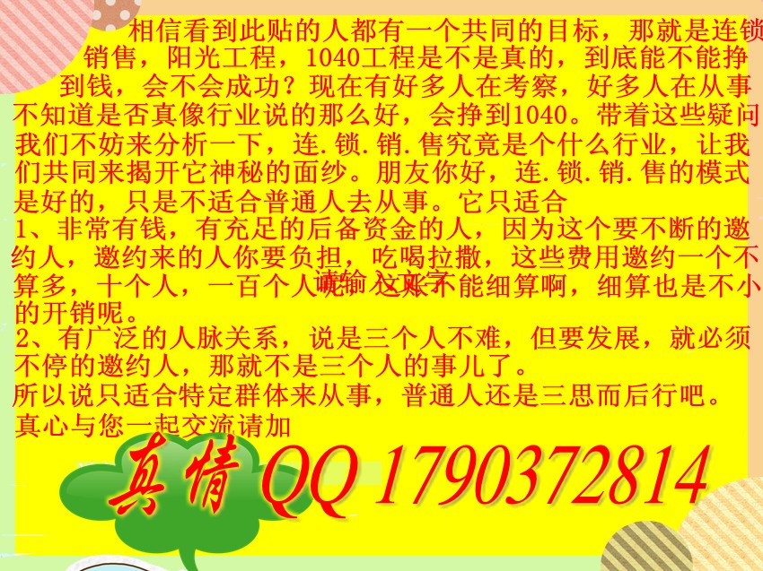 網(wǎng)絡(luò)連鎖創(chuàng)業(yè)導(dǎo)師全天在線QQ: 1790372814真情交流
