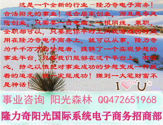 隆力奇陽光國際電子商務,一臺電腦,一根網(wǎng)線,足不出戶,在家創(chuàng)業(yè)。愿與廣大想改變命運的直銷朋友,攜手并肩,共創(chuàng)輝煌!