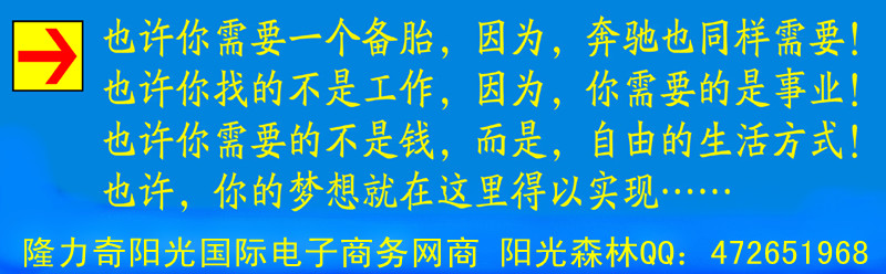 但是,隆力奇陽(yáng)光國(guó)際電子商務(wù)事業(yè),卻破解了這個(gè)難題,因?yàn)殡娮由虅?wù)將直銷的倍增制度完美的嫁接在國(guó)際互聯(lián)網(wǎng)。只要我們稍做宣傳,就會(huì)有成百上千的人主動(dòng)來(lái)找我們了解、合作。這是我們事業(yè)健康、快速發(fā)展的根本保證。