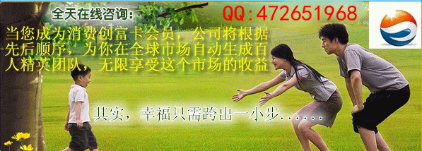 創(chuàng)富卡-創(chuàng)業(yè)+消費(fèi),一網(wǎng)運(yùn)作,雙網(wǎng)受益。這是所有直銷公司前所未有的舉措。全球直銷界首次推出,全球資源共享。又一次機(jī)會(huì)來(lái)到你的面前,和富人比速度,讓富人為你工作。創(chuàng)消費(fèi)創(chuàng)富互助卡會(huì)員對(duì)于窮人,是擺脫貧困的絕佳選擇,對(duì)于富人,又是增加財(cái)富的又一上好投資渠道。創(chuàng)富卡會(huì)員,讓你走上財(cái)富重新洗牌的快車道。
