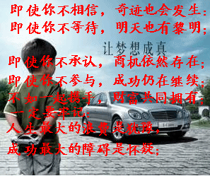 隆力奇為我們每位想創(chuàng)業(yè)的朋友搭建了一個(gè)非常好的創(chuàng)業(yè)平臺(tái),隆力奇公司董事長(zhǎng)徐之偉先生,給還在徘徊于創(chuàng)業(yè)路口的朋友們的一段勉勵(lì):每個(gè)人都曾萌發(fā)過(guò)事業(yè)成功的夢(mèng)想,但是很多人苦于找不到一個(gè)好的事業(yè)平臺(tái),而最終未能如愿。隆力奇定制營(yíng)銷為千千萬(wàn)萬(wàn)的夢(mèng)想者提供了一個(gè)實(shí)現(xiàn)夢(mèng)想的事業(yè)平臺(tái),只要我們能夠在這個(gè)平臺(tái)上把對(duì)事業(yè)成功的夢(mèng)想變成一種執(zhí)著的追求,就一定能成功。