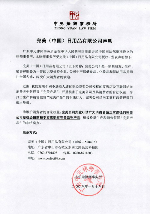 完美官方聲明堅決抵制假冒偽劣 呼吁消費者積極檢舉