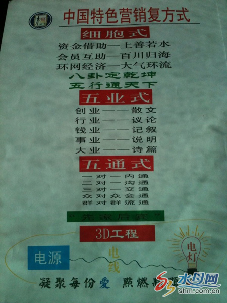 “我們這個(gè)機(jī)構(gòu)叫‘中國明明商’,是國家項(xiàng)目,是在去年6月才進(jìn)入山東的。”李某首先向記者介紹了“組織”的“大背景”,“國家要靠這種模式把外國人引進(jìn)的傳銷 、直銷,還有保險(xiǎn)、證劵這些東西一遭兒趕出中國去,不讓它們在社會(huì)上危害老百姓?!?br />