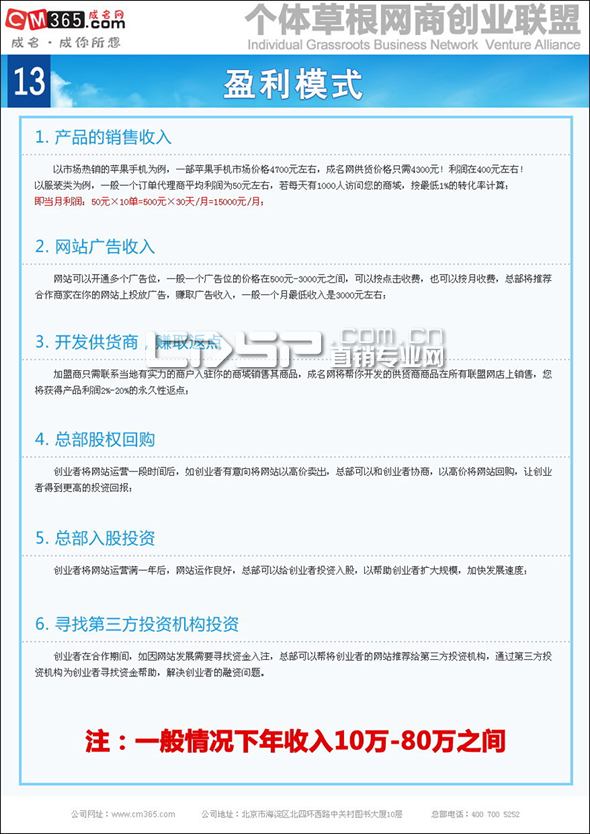 我們先來看看這個成名網(wǎng)的商業(yè)模式:加盟商加盟成名網(wǎng),首先要付6800的加盟費(fèi),付錢之后他們給我們一個獨(dú)立域名或二級域名,程序和服務(wù)器都是成名網(wǎng)的,加盟商對網(wǎng)站沒有任何的控制權(quán)力,只能賣成名網(wǎng)的產(chǎn)品,加盟商拿的只是提成,而6800的加盟費(fèi)也有些涉?zhèn)飨右?。?jù)加盟商透露,問題的關(guān)鍵是成名網(wǎng)內(nèi)部還有拉下線的提成,每天給加盟商洗腦,然后就是你騙我,我騙他的傳銷模式。顯然,如果按照加盟商的說法,成名網(wǎng)的確疑點(diǎn)不少。