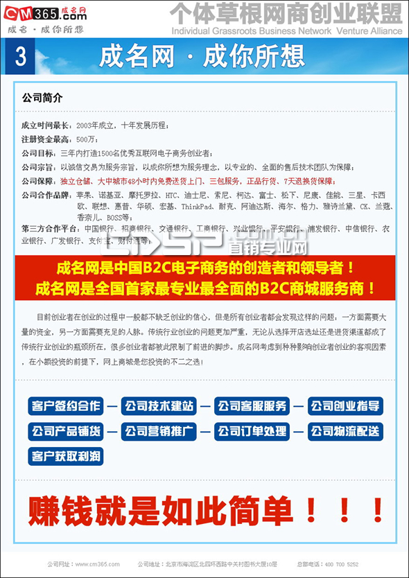 熱直銷網(wǎng)核心提示:“北京成名網(wǎng)電子商務(wù)有限公司是騙子公司!”近日,這樣的投訴在網(wǎng)絡(luò)上被大家熱議,有的網(wǎng)友甚至將成名網(wǎng)的詳細(xì)信息公布,“公司全稱:北京成名網(wǎng)電子商務(wù)有限公司,公司地址:北京市海淀區(qū)北四環(huán)西路68號左岸工社(中關(guān)村圖書大廈)10層,公司全稱:北京成名網(wǎng)電子商務(wù)有限公司,公司網(wǎng)站:http://www.cm365.com (網(wǎng)站負(fù)責(zé)人:謝成明 2010-06月份建立的網(wǎng)站)公司電話:400-700-5252 成名網(wǎng)廣告宣傳語:“月賺300萬” 。