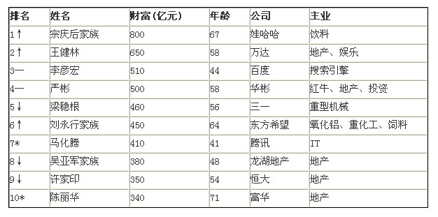 | 2↑ | 王健林 | 650 | 58 | 萬達 | 地產(chǎn)、娛樂 |